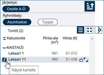 Näytä tontit luettelomuodossa.